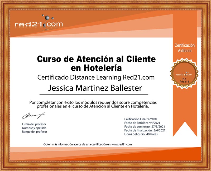 Al presentar, y aprobar la prueba final, recibirás un certificado de Aprobación del curso emitido por la Distance Learning Red21.com Corporate System reconocido por las principales empresas bajo la modalidad de enseñanza privada. A continuación un ejemplo de un certificado.